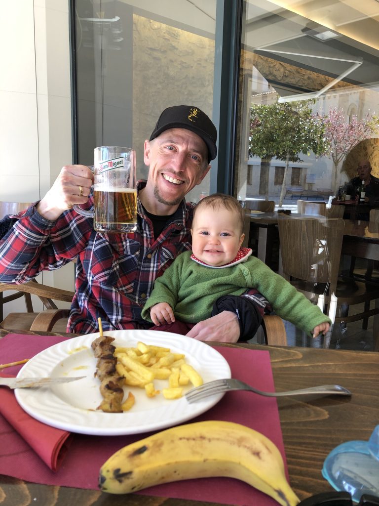 … und ihr erster ordentlicher Besuch im Restaurant. Für Mama und Papa gab es eines der angepriesenen Mittagsmenüs, für Lottchen eine Banane, eine Reiswaffel und Brot. Man könnte sagen, unser erstes richtiges gemeinsames Mahl an einem Tisch.