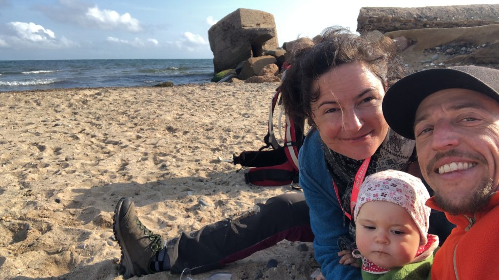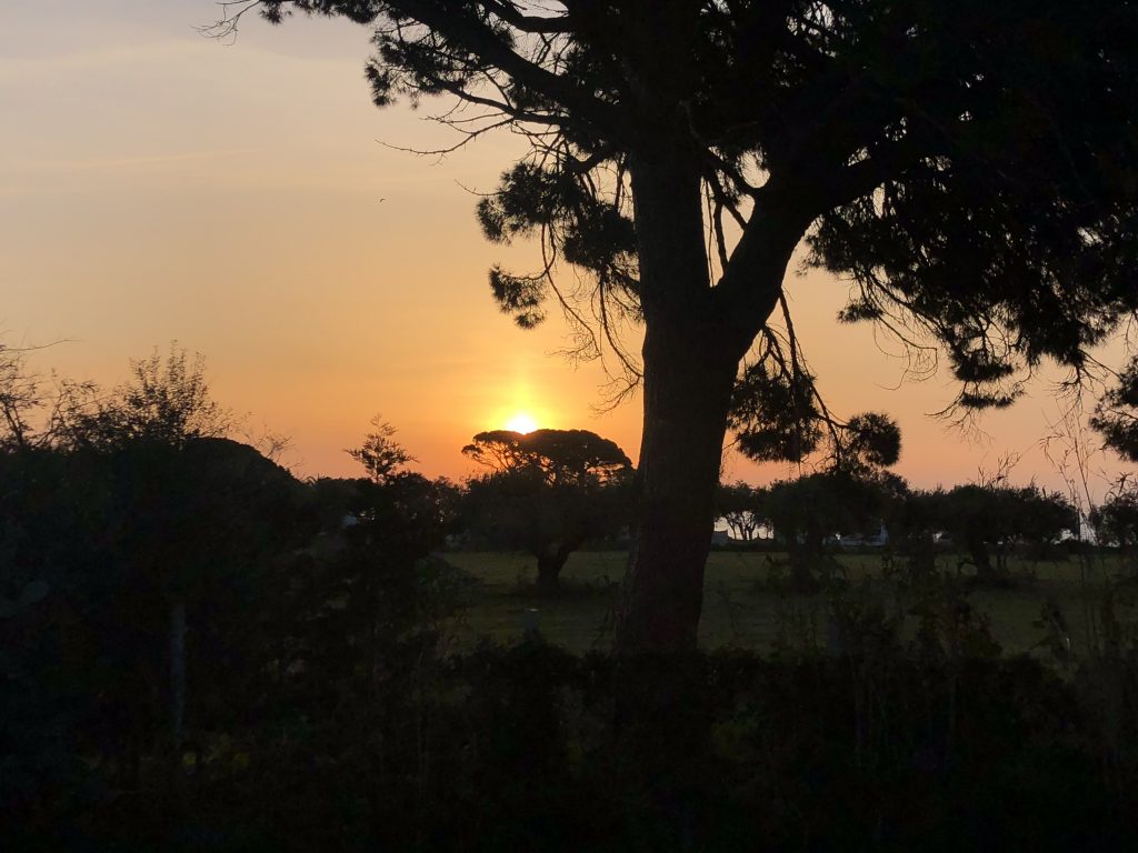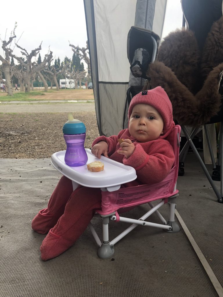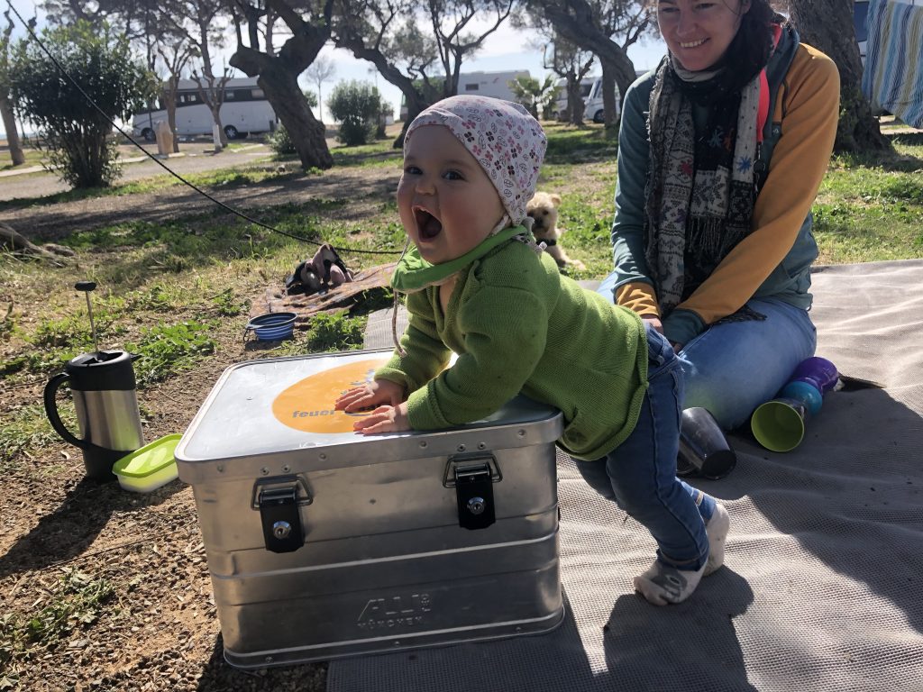 Wir halten uns einigermaßen an die verhängte Ausgangssperre und beschränken uns auf eine Runde über den Strand am hinteren Ende des Platzes, entlang der Straße neben dem Campingplatz und durch den Haupteingang wieder zurück zum Camper. Jeden Morgen gibt es den ersten kleinen Snack für Lottchen mit Blick aufs Meer und die aufgehende Sonne, für Papa einen Kaffee.