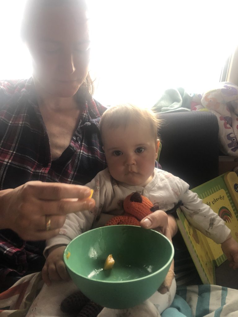 Weil Schlafen wiederum hungrig macht, klingelt um 12 auch schon das Glöckchen zum Mittagstisch. Hier stellen wir uns noch nicht wirklich geschickt an. Der übliche Mittagsbrei blieb schon einige Zeit her auf der Strecke. Nun wird gekocht was Erwachenenessen schon ziemlich nah kommt. Gut an kommt es jedoch nicht immer. Wir versuchen und in Kartoffel, Karotte, Nudeln mit Tomatensoße, Süßkartoffeln, Reis… Alles in einem Zwischenstadium von Brei und Ursprungsagregatzustand.